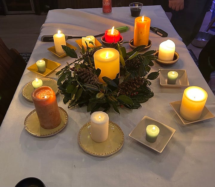 To honor the Winter Solstice and close out the year, we hosted a small potluck gathering on December 19th, led by Patrick Seyler, to express gratitude for 2025 and set our intentions for 2026. The candle formation represented the sun in the middle and the 12 months around it.