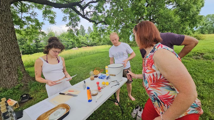 Then, at the end of June, we started our Nocino Crafting workshop—the first for Longview Farm! We harvested walnuts around the property and put them in jars with grain alcohol, cloves, cinnamon, coffee beans, lemon peel, and all spice.