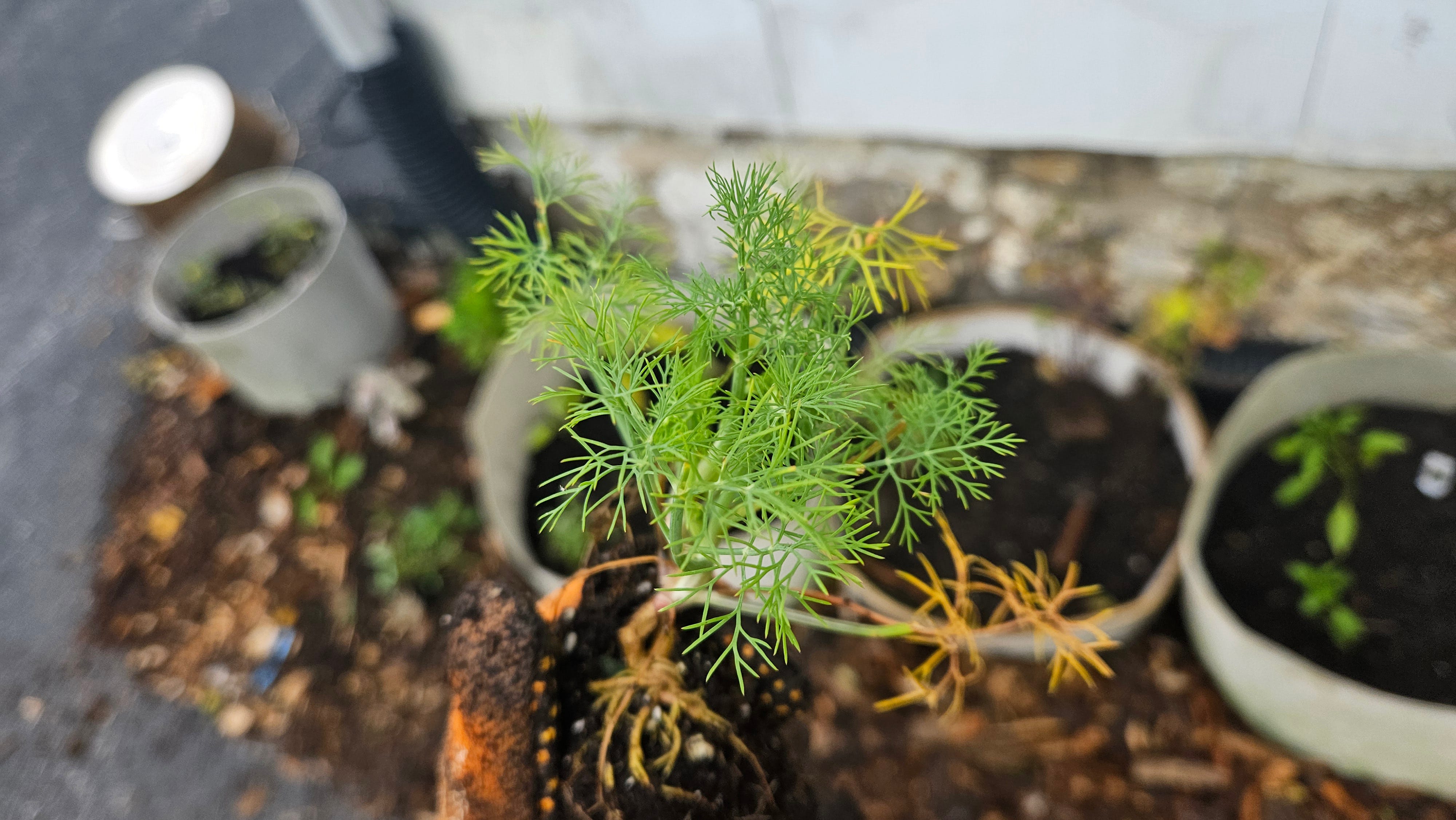 I emptied out 5 canvas totes of their overgrown contents, used egg cartons and mulch as filler, laid down some fresh potting soil and planted the herbs and nightshades left over from the Earth Day event we hosted last month.